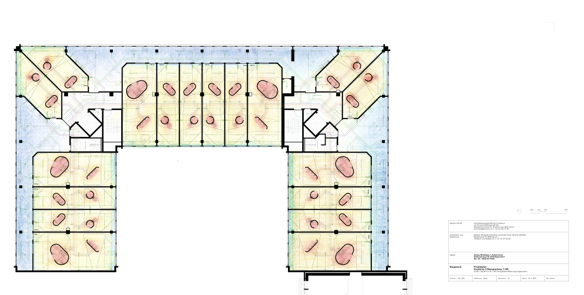 Ausgangspunkt war, wie einleitend beschrieben, ein Bürohaus der 1980er-Jahre. Üblicherweise werden im Rahmen von Sanierungsmaßnahmen die Fassaden mit besseren Fenstern und neuer Wärmedämmung ausgestattet, um den aktuellen Normen und Energiestandards gerecht zu werden. Solche energetischen Sanierungen sind konstruktiv aufwändig und teuer. Zudem führen die Optimierungen der Fassadenperformanz kaum zu einem spürbarem Mehrwert im Wohnen. Nur die Mieten werden teurer. Beim Winkelbau blieben die Fassaden erhalten, ebenso Tragstruktur, Treppenhäuser, Lifte sowie zwei bestehende Sanitärkerne. Statt die Hülle energetisch zu ertüchtigen, wurden die Mittel in erneuerbare Heizenergie gelenkt. Der Eingriff beschränkte sich damit auf reversible, präzise Setzungen im Ausbau und eine räumliche Neuorganisation der Nutzungen. Das Projekt schlägt eine Alternative zur üblichen, flächigen Temperierung vor: nicht der gesamte Innenraum wird auf eine uniforme Temperatur von 21 °C gebracht, sondern einzelne Zonen werden gezielt aktiviert, so dass eine Temperaturlandschaft entsteht, die das Wohnen funktional und sinnlich gliedert. Schlafen wird kühler, Kochen wärmer, Arbeiten moderat temperiert stattfinden.