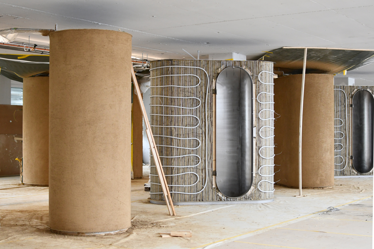 Die freistehenden, mit Lehm verputzten Metallelemente sind trotz solider Bauweise nicht an ihre Position gebunden, sondern lassen sich neu im Raum positionieren oder am anderen Ort nachnutzen