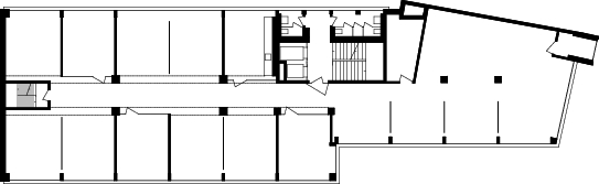 Die Tragstruktur des Skelettbaus ist nur auf den ersten Blick regelhaft aufgebaut. Im Bereich zwischen Straße und Hof weist sie vier Tragachsen auf – zwei an den Fassaden, zwei im Innenraum –, die sich im schlankeren Kopf auf drei reduzieren. Die Fassadenstützen sind doppelt so eng gesetzt wie die inneren Stützen. In den Regelgeschossen werden die beiden inneren Stützenreihen je von einem Unterzug überspannt, der im Kopf wie auch im Erdgeschoss „fehlt“, womit die Stützen also auf eine Flachdecke treffen. Noch größere „Verschmutzungen“ fanden wir im Wohngeschoss auf dem Dach vor. Hier wurde die eine Stützenreihe mit Unterzug durch eine tragende Betonwand ersetzt, die lediglich über einzelne Türöffnungen die beiden Seiten räumlich verband. Aufgrund der tragenden Wand ist der Unterzug im Geschoss darunter schwächer armiert als die anderen. Schließlich ist das Wohngeschoss weniger hoch, was sich in einem schmaleren Fensterband an der Fassade abzeichnete. Der tiefere Sturz beschnitt im Blick nach draußen den Horizont.