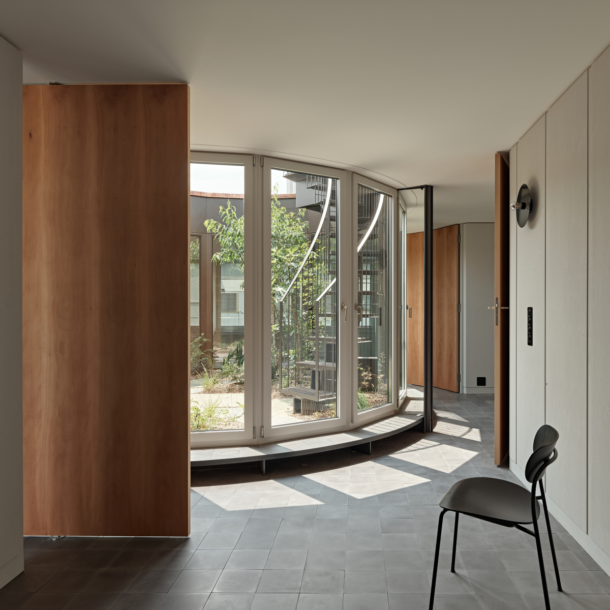 Die Grundrissdisposition folgt dieser Logik. Der vormals mittig liegende Bürokorridor rückt an die nordseitige Fassade und bildet dort eine unbeheizte Pufferzone. Dieser Erschließungsgang ist für die Wohngemeinschaft zugleich Ort der Begegnung, des Arbeitens und des Blicks nach draußen. Räumlich ist er mit den Küchen und damit den gemeinschaftlichen Räumen verbunden; Arbeitstische entlang der Fenster verankern ihn im alltäglichen Gebrauch. Die Wohnungen selbst orientieren sich nach Süden und in die Ecken des Winkels. Sie sind als kompakte, eigenständige Einheiten gefasst. Insgesamt entstanden 18 Einheiten zwischen 36 und 56 m², davon sechs barrierefrei. Waschmöglichkeiten und eine gemeinschaftlich nutzbare Dachterrasse ergänzen das Programm des Wohnens um eine soziale Infrastruktur. Der Bestand wird so funktional umgenutzt und in seiner Typologie aktualisiert.