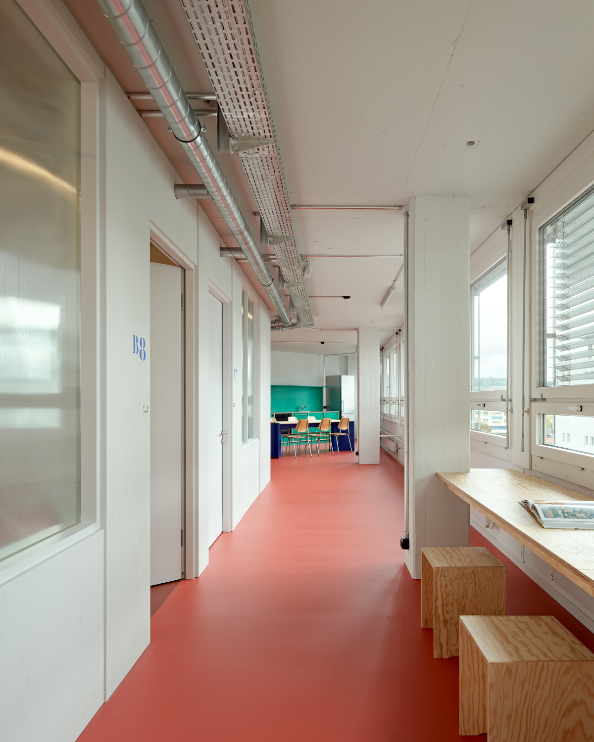 Unterschiedliche Auftraggeberinnen und Ausgangslagen vor Ort haben zu zwei verschiedenen Strategien der Transformation geführt. In Regensdorf bestand die Absicht, mit möglichst geringen baulichen und finanziellen Mitteln güns-tigen Wohnraum für Studierende zu schaffen, der das Wohnangebot der Neubauten auf dem Areal ergänzt. Das beschränkte Budget begründet sich zudem mit der Unklarheit darüber, was mittelfristig mit dem Gebäude passieren soll. Es handelt sich deshalb um eine temporäre Nutzung, die einen experimentellen, forschenden Hintergrund haben sollte. Die dafür entwickelte Umbaustrategie lässt sich mit einem as found beschreiben: Der tragende Rohbau, die Fassade wie auch die Unterlagsböden wurden als gegeben angenommen und sollten keine Eingriffe erfahren. Der Neuausbau des Skeletts erfolgte nach dem Prinzip einer minimalinvasiven Addition: dem reversiblen Hinzufügen und Einbauen. Das hier beschriebene und von EMI Architekt*innen realisierte Projekt umfasst ein Geschoss. Ein zweites Geschoss wurde nach den Plänen vom baubüro in situ umgebaut. Beim Projekt „Das wohltemperierte Haus“ von EMI lag der experimentelle Charakter in der Erforschung einer „Temperaturlandschaft“, beim Projekt von in situ beim Schwerpunkt des Re-use.