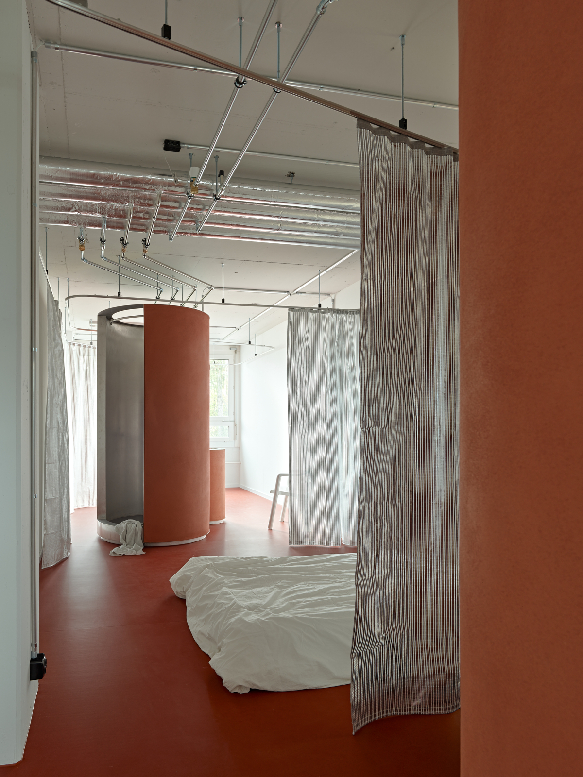 Offen verlegte Versorgungsleitungen und textile Raumteiler schaffen eine ganz neue Ästhetik, ohne dass die Planer*innen in die Gebäudesubstanz eingreifen mussten