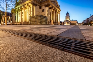 Die Rinnen mussten hohen gestalterischen und bautechnischen Anforderungen entsprechen. Die Berliner Denkmalpflege akzeptierte nur Kastenrinnen mit Guss-Kantenschutz und einem Längsstabrost aus Gusseisen, die dem historischen Vorbild nahekommen. Die Planer legten Wert auf Stabilität und Tragfähigkeit, da der Gendarmenmarkt bei Veranstaltungen wie dem Weihnachtsmarkt oder Classic Open Air von Schwerlastverkehr befahren wird. Die Rinnen müssen dieser Belastung standhalten, auch ohne durchgängige Rückenstützen, die das historische Pflasterbild beeinträchtigen würden. Diesen Design-Vorgaben der Denkmalpfleger erfüllten die Kastenrinne aus der ACO PowerDrain Seal in Produktreihe. Zudem verfügt der Rinnenkörper über eine EPDM-Dichtung, die Feinststoffe abhält und das Oberflächenwasser vollständig zum Vorfilter leitet.