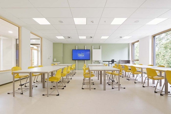 Und wenn doch einmal Frontalunterricht gewünscht ist, ist das auch kein Problem: „Beim Heisenberg-Gymnasium haben wir Fenster integriert, die eine Sichtlinie zwischen zwei Klassenräumen durch die Cluster-Mitte bilden. Wie die Lehrerschaft aber mit diesen Fenstern, mit dem Raum an sich umgeht, ist flexibel: Ob das Fenster wirklich nur als Fenster genutzt, Tafel oder fürs Brainstorming mit Post-it-Zetteln einsetzt wird, ist ganz individuell.“ Die hochmoderne technische Ausstattung eröffnet eine Vielfalt digitaler Lern- und Unterrichtsmethoden und eine vollständig barrierefreie Gestaltung sorgt dafür, dass alle Schülerinnen und Schüler Teil der Gemeinschaft sein können.