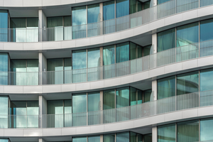 Wie Wellen – konkav oder konvex geformt, kommt die organische Gebäudehülle dazu ganz ohne massive Stützen aus. Realisieren ließ sich das Tragwerkskonzept durch die statische Auslegung der Flurwände, die über sechs Geschosse die Tragfunktion übernehmen. Zudem gehen tragende Wandschotten strahlenförmig davon ab. Diese innere Struktur erlaubt die dynamischen Schwünge und Radien der umlaufenden großformatigen Keramikplatten, die in einer Länge von 1.200 bis 1.550 mm und einer Plattenhöhe von 614 mm sowie 40 mm Plattendicke montiert wurden.