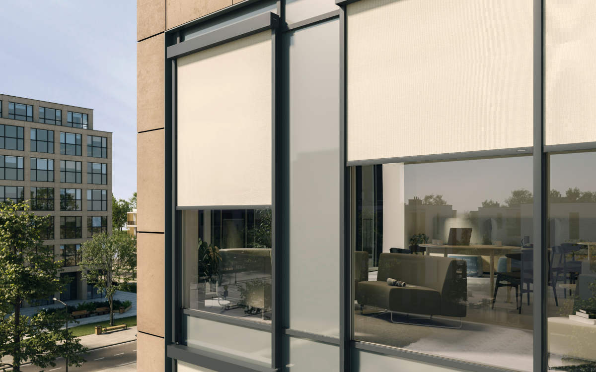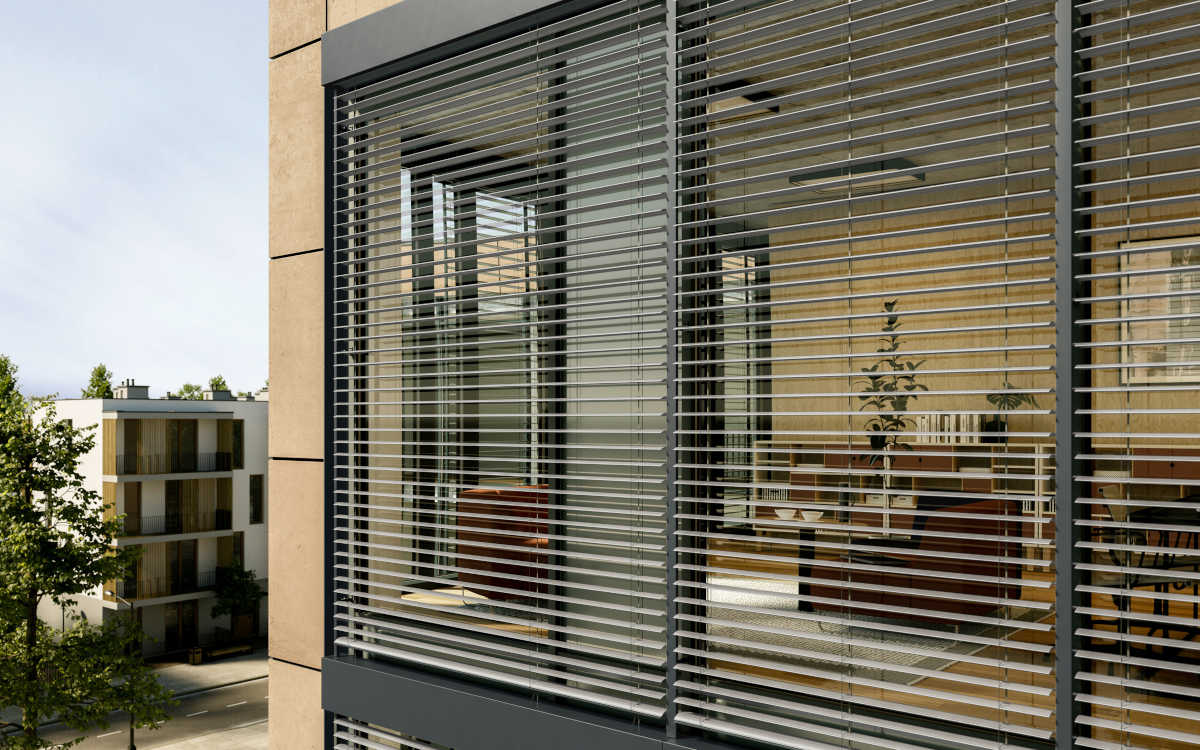 Der Abstand des Raffstores zur Fassade lässt sich auf nur 25 mm reduzieren. Dadurch sitzt dieser besonders nah an der Pfosten-Riegel-Konstruktion und fügt sich harmonisch in das Fassadenbild ein.