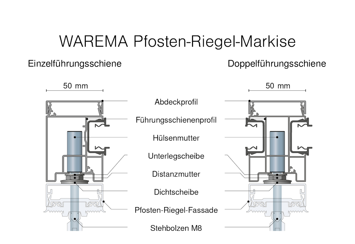 Besonders schön integriert ist die Markisen-Variante mit easyZIP-Führung. Die neuen Aluminium-Strangpressprofile der Führungsschienen werden direkt auf die Glashalteleisten gesetzt und wirken optisch wie Teil der Pfostenstruktur. In der gewählten Systembreite entsprechen sie einem Großteil aller ausgeführten Pfosten-Riegel-Konstruktionen. Unabhängig von Systemgebern können diese Führungsschienen auf nahezu alle gängigen Konstruktionen montiert werden. Sie sind auch auf anderen Pfostenbreiten aufsetzbar. Durch einfaches Aufstecken und Verschrauben auf zuvor gesetzte Stehbolzen sind sie schnell montiert. Auch die Kastenmontage gestaltet sich einfach.
