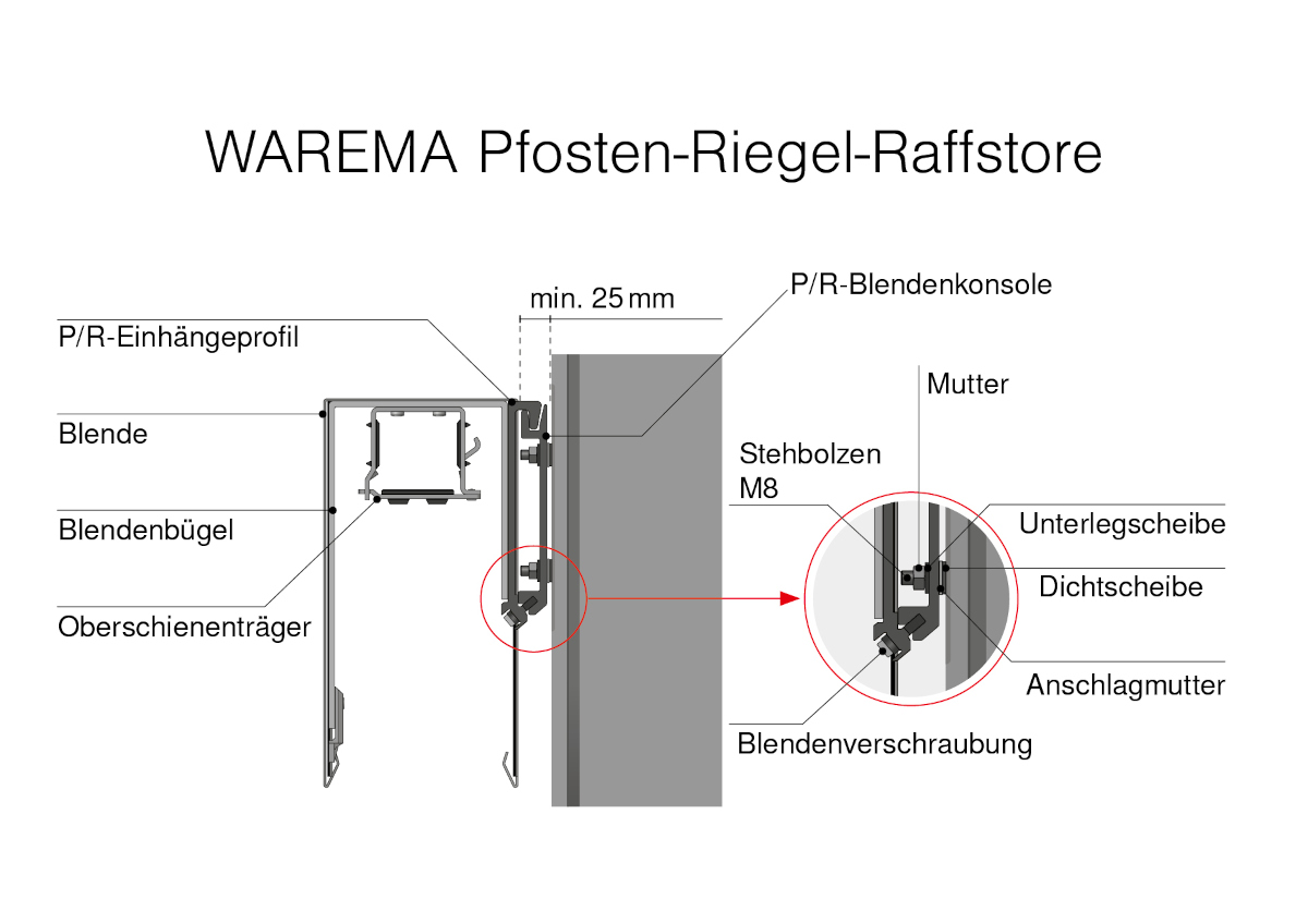 Beim Raffstore wurden die bewährten Konstruktionen der Führungsschienen sowie die Seilführung beibehalten. Diese Lösungen ermöglichen eine dezente Fassadengestaltung bei optimaler Lichtlenkung. Das Highlight: Neu entwickelte Konsolen ermöglichen jetzt einen minimalen Abstand der Blenden zur Fassade von nur 25 Millimetern. Dies verbessert die Fassadenoptik deutlich. Vorteil bei der Montage: Die komplett vormontierten Blenden werden einfach von oben in eine Nut der Konsole eingehängt, seitlich ausgerichtet und verschraubt.