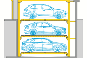 Der Combiparker 560 bietet ein variables Parkraumkonzept mit bis zu fünf Ebenen. Dabei kann das System flexibel, ausgehend von der Einfahrtsebene bis zu vier Ebenen nach oben oder unten geplant werden – je nach baulicher Situation. Mit einer Standard-Tiefgaragenhöhe von 2,50 m wird der vorhandene Raum optimal genutzt. Die Plattformen sind für eine Belastung von 2,6 Tonnen ausgelegt und eignen sich somit auch für größere Fahrzeuge wie SUVs oder Elektroautos.