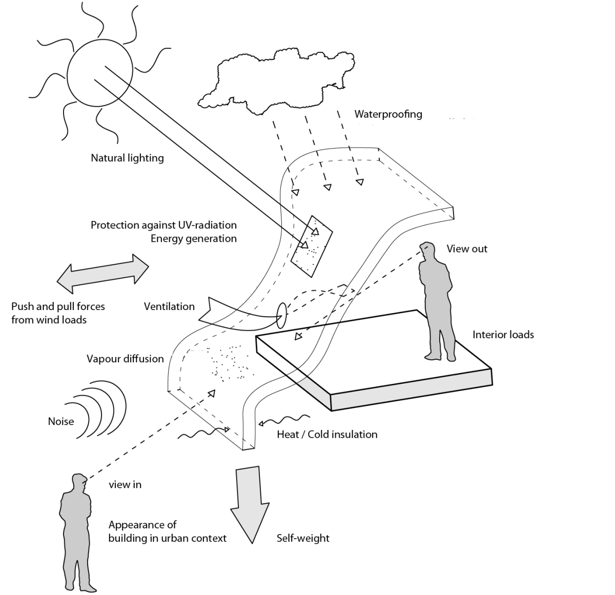 Um eine zeitgemäße Gebäudehülle mit allen resultierenden Konsequenzen zu entwickeln, müssen die performativen Eigenschaften dieser Gebäudehülle deutliche Verbesserungen erreichen – auch und gerade in der konventionellen Fassadentechnik. Im Idealfall können die Anforderungen an eine dynamische Gebäudehülle [1] erfüllt werden: Klimaregulierung durch atmungsaktive Materialien, Lastabtragung durch optimierte, schlanke Tragwerke, Komfort durch aktive Dämmung und Lüftung, integrierte Technik für den Nutzer, Leistungsfähigkeit für Belichtung und Verschattung bei adaptiver Transparenz, Entwurfsgerechte Erscheinung [2].
