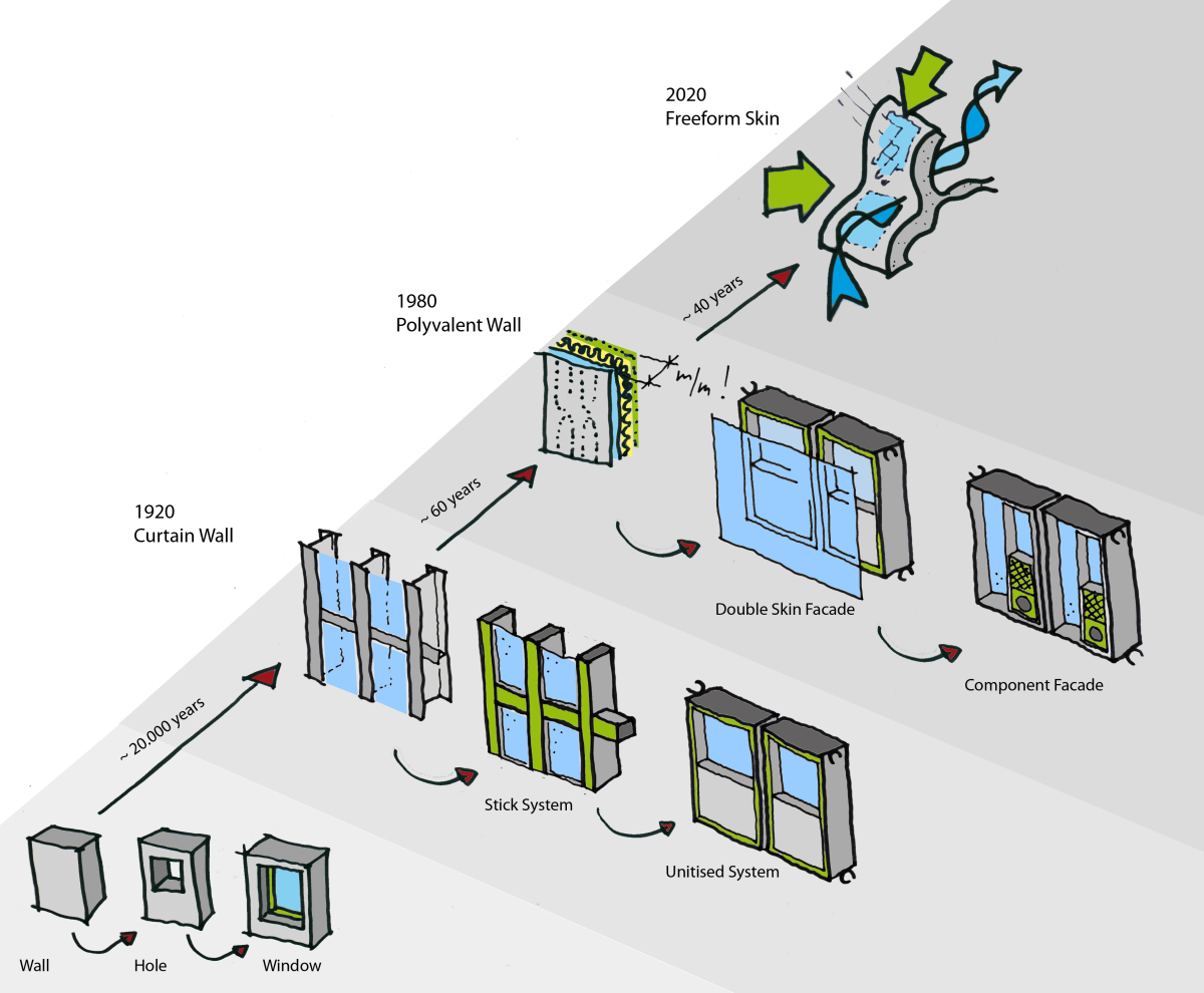 Die Haut des Menschen ist das Ergebnis einer Evolution über Millionen Jahre. Die heutige Fassadentechnik dagegen geht auf die Entwicklung der Vorhangfassade in den 1920er-Jahren zurück und befindet sich zeitlich gesehen somit noch in der frühen Embryonal-Phase der Fassadenevolution. Vielleicht gibt es die perfekte Fassade, auf die alle Entwicklungen hinauslaufen, daher erst in ein paar Millionen Jahren.