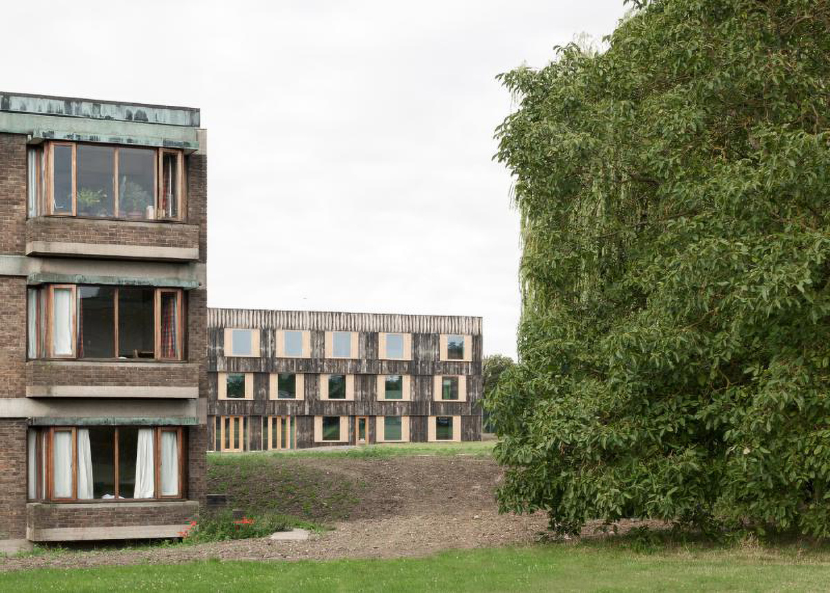 Cowan Court, Churchill College der University of Cambridge/GB: Ergänzungsneubau mit wiederverwendeter Holzfassade von 6a architects