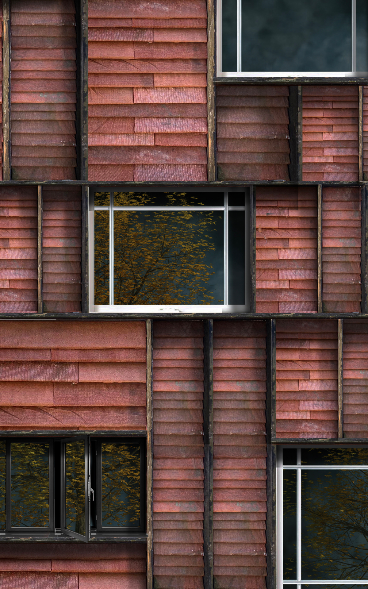 zerschnittene Lüftungsrohre als Schindelfassade (Mock-up aus der Studie „Rebeauty - Nordic Built