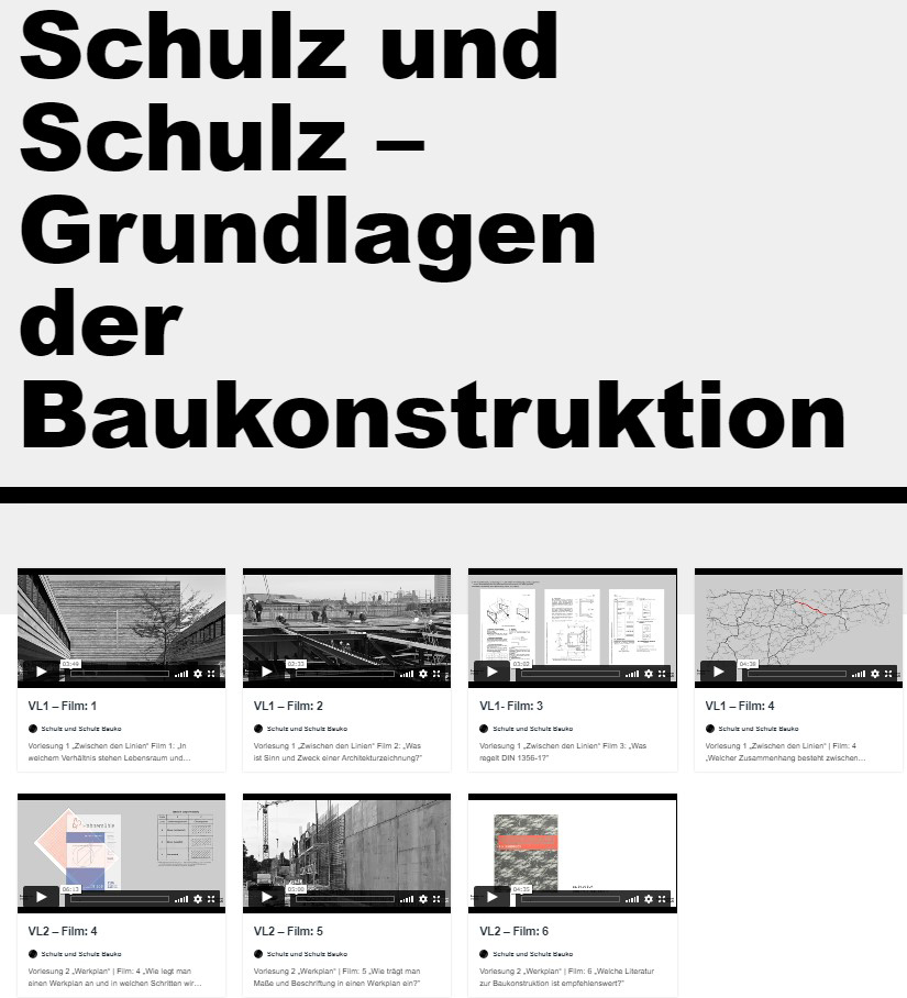 Als Teil der Fakultät Architektur der TU Dresden haben Ansgar und Benedikt Schulz die Professur für Entwerfen und Konstruieren I inne. Im Rahmen ihrer Lehre produzieren sie regelmäßig Videotutorials, die Grundlagen der Baukonstruktion vermitteln. In mehreren kurzen Filmen werden Themen wie Dachabdichtung, Sockel oder Schwelle gebündelt aufbereitet.