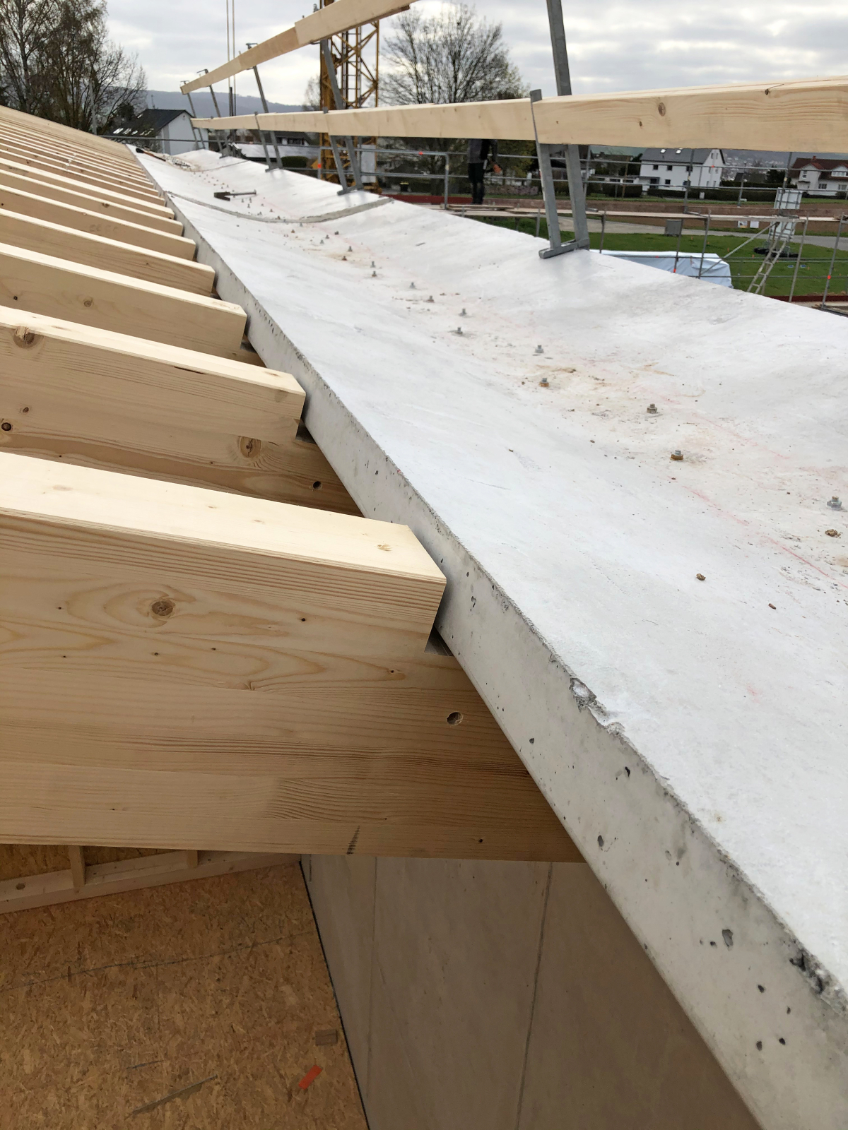 Die Trennung der Brandabschnitte erfolgt über eine Stahlbetonwand, die sich bis in die Dachkonstruktion fortsetzt. Ein in die Dachfläche integrierter Betondeckel verhindert den Brandüberschlag, ohne von außen sichtbar zu sein. Die exakte Positionierung dieses Bauteils war entscheidend, da nachfolgende Holzelemente direkt darauf aufbauen.