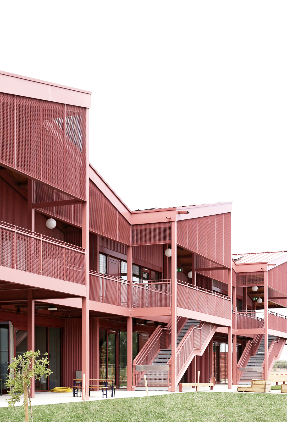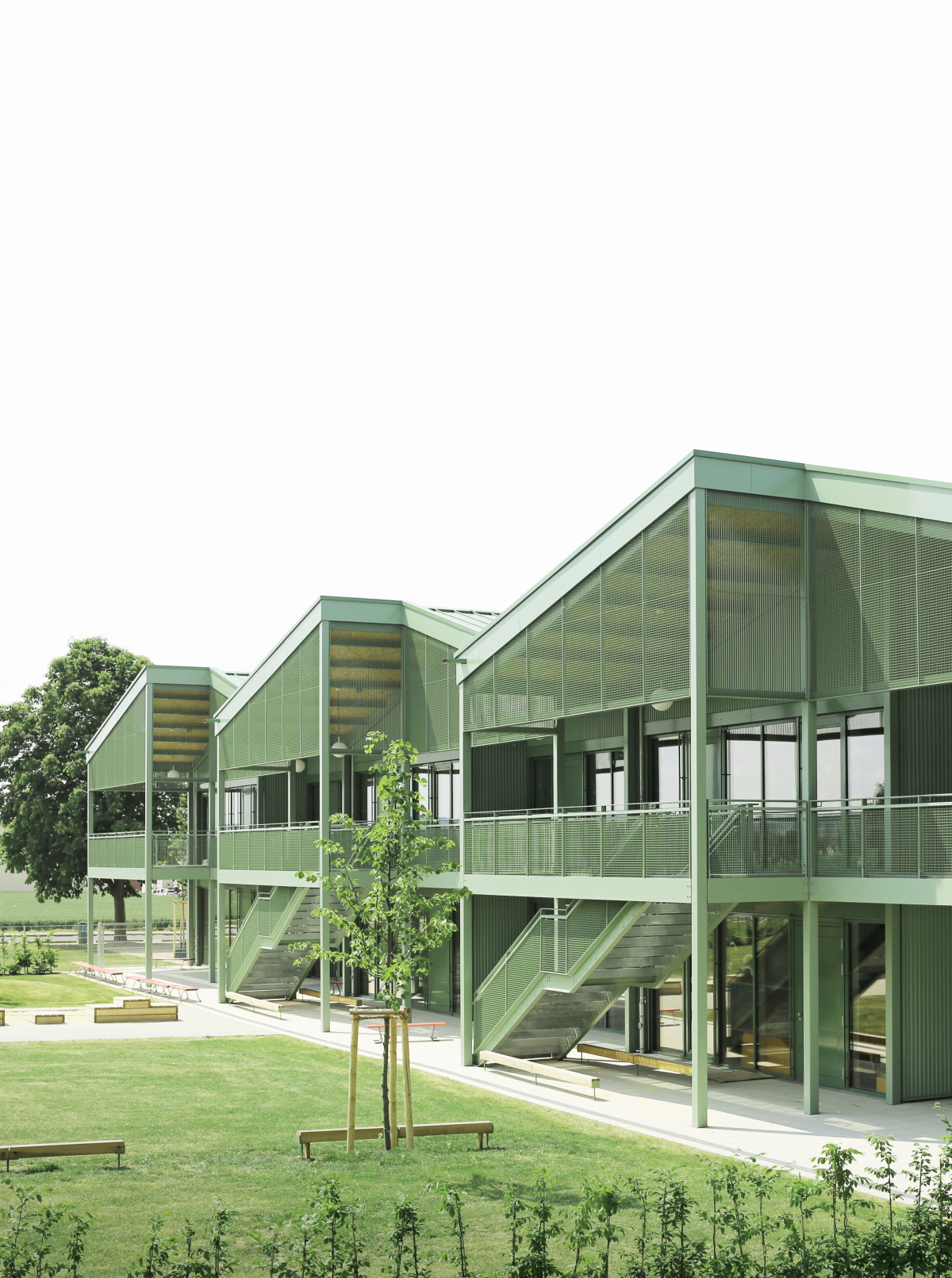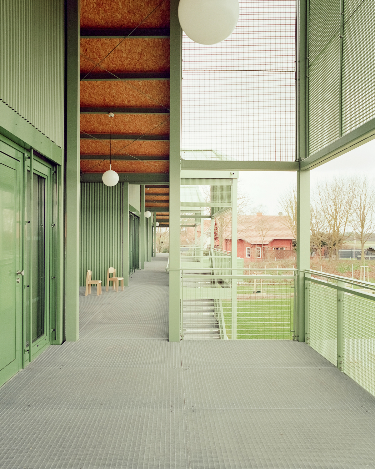 Die Außenwände sind in Holzständerbauweise errichtet und durch eine Fassade aus grün bzw. rot lackiertem Stahltrapezblech ergänzt. Eine zentrale Rolle spielt der breite außenliegende Laubengang, der als Stahlkonstruktion ausgeführt ist und dem Holzbaukörper vorsteht. Er fungiert als Pufferzone, bietet Witterungsschutz und schafft nicht nur bei schlechtem Wetter zusätzliche Aufenthaltsqualitäten für die Kinder.