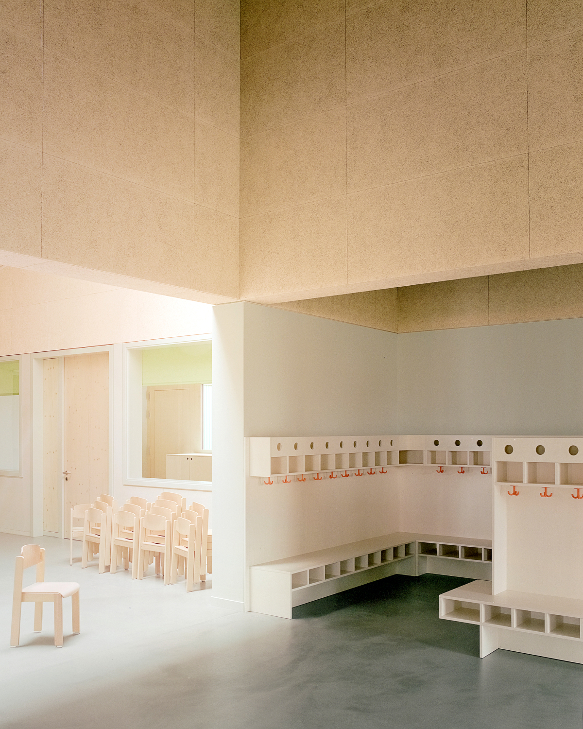 Der Zugang erfolgt über einen kleinen Vorplatz. Ein überdachter tiefer Eingangsbereich führt in ein Foyer, das als Treffpunkt für Eltern und Kinder in der Bring- und Abholphase konzipiert ist. Gemeinsam mit einem angrenzenden Raum ist das Foyer mit öffenbaren Wänden multifunktional angelegt und ermöglicht so flexible Nutzungen, auch über den Kita-Betrieb hinaus – etwa als Wahllokal mit eigenem Eingang zum Garten hin.