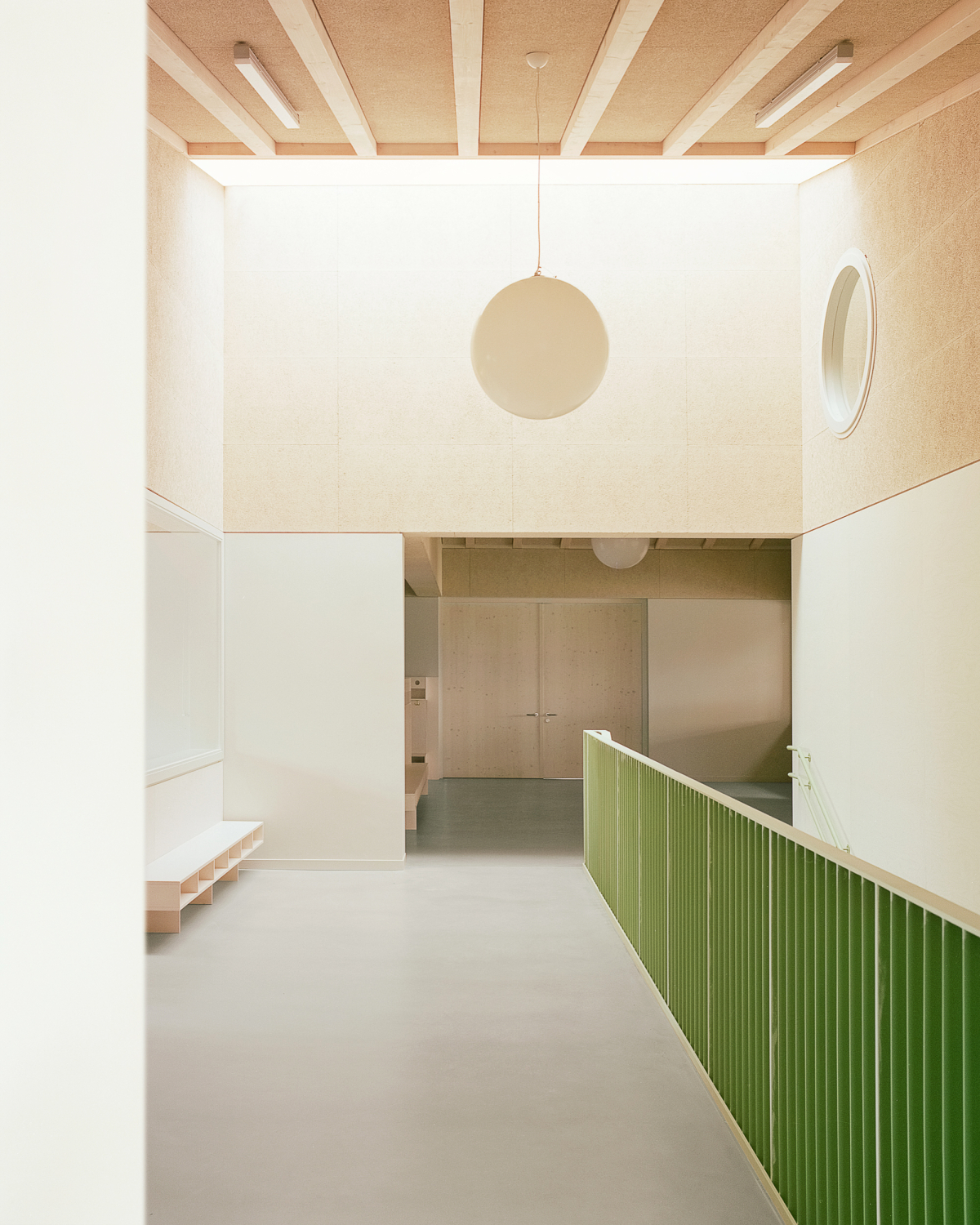 Auch das von Löser Lott vorgegebene Farbkonzept orientiert sich an landwirtschaftlichen Vorbildern und unterstützt die Lesbarkeit der Raumstruktur. Ergänzungen wie nachträglich installierte Sicherheitsnetze vor den offenen Treppenaufgängen durch die Kita-Betreiber oder Verdunkelungen der Sichtfenster in den Türen zu den Schlafenszeiten der Kleinsten zeigen, dass sich die Gestaltung im Betrieb immer weiterentwickelt.