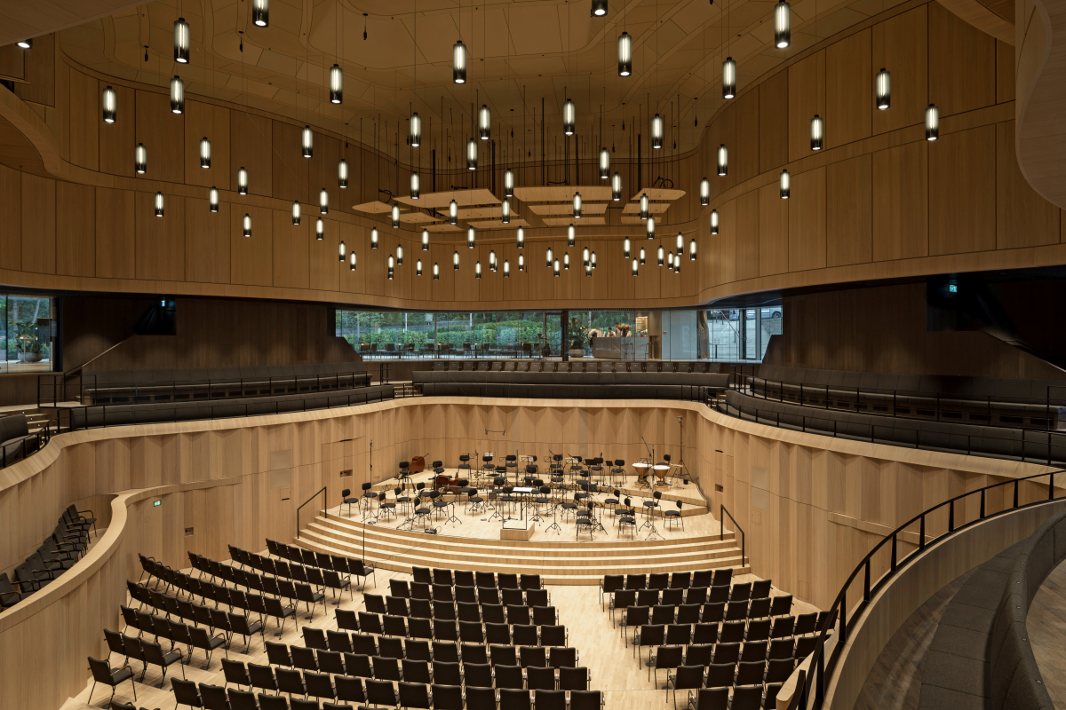 „Schuhkarton“ oder „Weinbergsaal“? Diese Frage stand am Anfang des Planungsprozesses für den Konzertsaal. Unter „Schuhkarton“ verstehen Planerinnen und Planer einen rechteckigen Saal mit frontalem Orchester. „Weinbergsaal“ heißt, dass sich das Orchester in der Mitte befindet und die Sitzreihen rundherum ansteigen. Wäre es allein nach Staab Architekten gegangen, wäre es in Kronberg ein Weinbergsaal geworden. Damit hatten sie schließlich 2014 den Wettbewerb gewonnen. Für den erst nach dem Wettbewerb vom Bauherrn hinzugezogenen niederländischen Akustiker Martijn Vercammen von der Peutz Group war jedoch der gerichtete Saal des „Schuhkartons“ die bevorzugte Variante. Gemeinsam mit dem Akus tiker, der u. a. das für seine Akustik bekannte Concertgebouw Amsterdam mitgeplant hatte, entwickelten Staab Architekten schließlich einen geschwungenen Freiformsaal, der zwar nach vorn ausgerichtet ist, jedoch auch Sitzreihen um das Orchester sowie konkave wie konvexe Reflexionsflächen aufweist.