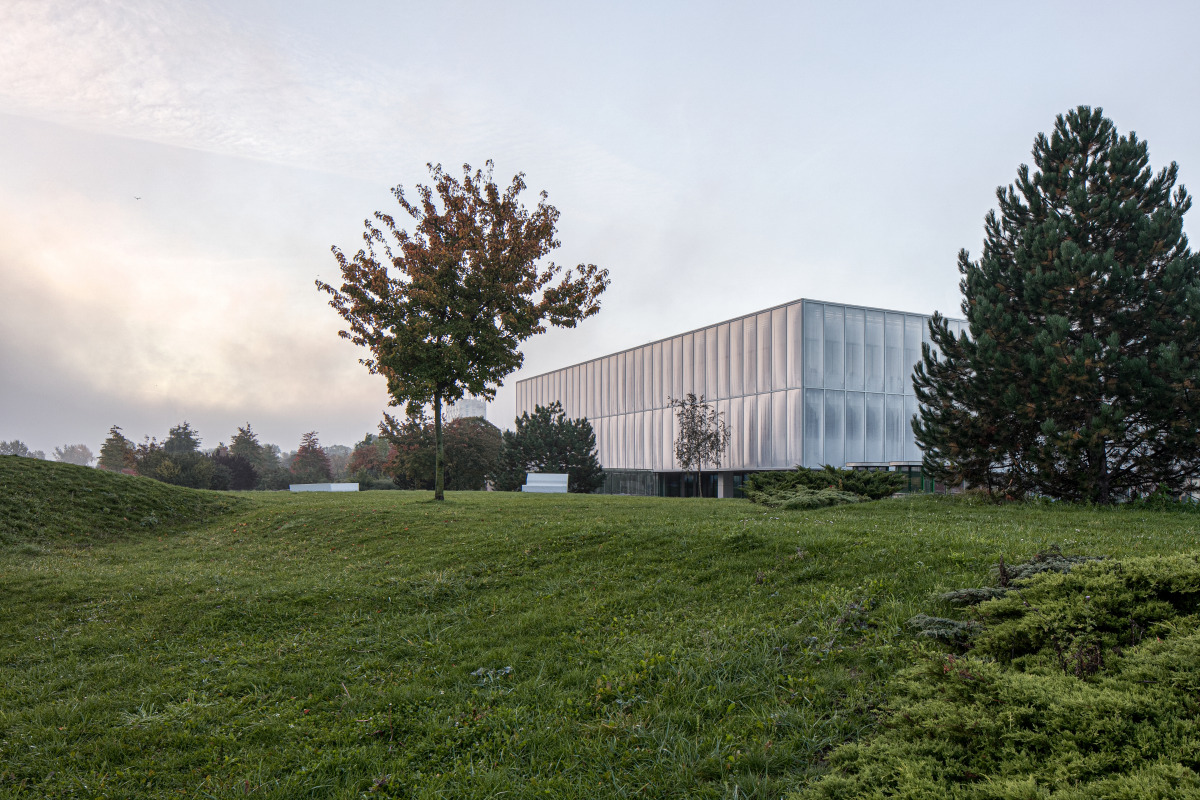 „Als wir uns an dem Wettbewerb für das neue didaktische Forschungszentrum beteiligten, war uns klar, dass sich die Modernität der Nutzung auch an der Fassade ablesen lassen soll“, sagt Anna Stryszewska-Słońska, Projektarchitektin im Breslauer Büro von heinlewischer. Der Anfang des Jahres fertiggestellte Neubau sollte nach Vorgaben des Bauherrn Platz für verschiedene, flexible Labor- und Werkstattsituationen bieten, technisch und energetisch auf der Höhe der Zeit sein und architektonisch einen Kontrapunkt zum Bestandsgebäude des polnischen Architektenbüros RAr-2 Laboratorium Architektury Gilner & Kubec setzen. Dessen Fassade ist mit länglichen Paneelen in rosttönen bestückt, die hier und da von fassadenhohen, asymmetrischen Fensterschlitzen unterbrochen werden. Ein typischer Ausstellungsbau der 2010er-Jahre, der auf Fernwirkung und für Publikumsverkehr ausgelegt ist. Der Neubau gibt sich dezenter, wenn auch nicht weniger spektakulär: Die vor der Fensterfront der Obergeschosse gelagerte Membranfassade aus luftgefüllten Folienkissen verleiht der schlichten Kubatur des 7 114 m² Bruttogeschossfläche großen Baus, der aus Erd-, Unter- und zwei Obergeschossen besteht, eine schwebende Leichtigkeit; zugleich aber auch eine gewisse Privatheit, da die klare Durchsicht vor allem im engen, frontalen Winkel gegeben ist. Seitlich versetzt reflektieren die Polster der Folien mehr vom Umgebungslicht, als dass sie vom inneren Geschehen preisgeben. „Die Fassade ist sicher einer der wesentlichen Gestaltungsfaktoren bei diesem Projekt. Sie übernimmt aber auch verschiedene technische Funktionen, die auf die Nachhaltigkeit und Effizient des Gebäudes einzahlen“, so Anna Stryszewska-Słońska. So dient die Membranfassade nicht nur als Kältepuffer im Winter, sondern kann dank der steuerbaren Lüftungsschlitze im Fassadenabschluss auch für Kühlung im Sommer sorgen.
