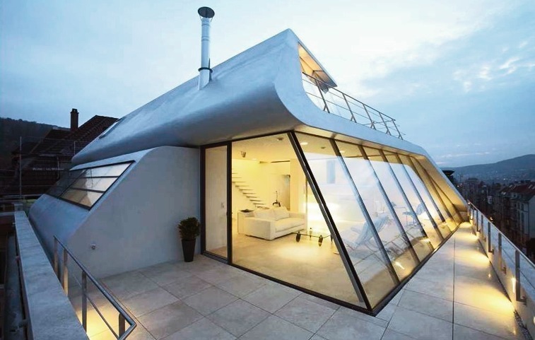 Ist kein Bauplatz vorhanden, geht man aufs Dach. Was immer wieder ein Experiment der ganz besonderen Art und Weise ist. Insbesondere hohe Bauauflagen – Statik, Brandschutz, aber auch Denkmalschutz oder andere Gestaltungsauflagen – verhinderten hier schon manches Projekt weit vor der Planeinreichung. In Stuttgart, Immenhoferstraße 40, ist der Gang aufs Dach gewagt und Ende letzten Jahres vom Tübinger Architekten Florian Danner erfolgreich und mit Blick auf die Details höchst elegant wie anspruchsvoll umgesetzt worden. In der organisch gestalteten Holzkonstruktion des Penthouses, die von einer lichtgrauen Polyuretanhaut überzogen wurde, liegen zwei Maisonette-Wohnungen. Der offene Grundriss oder die Treppenstufen aus in die Wand gesteckten Stahlschwertern sind Ausschnitte aus einem Architekturprogramm, das sich schlichter Schönheit verschrieben hat. Das auch im Sommer dann wie schneebedeckt erscheinende Penthouse steht auf einer den Altbau schließenden Natursteinplattendecke; der Altbau wird damit zum Sockel für einen Alien. Die von diesem nicht überdeckten Flächen sind der Luxus einer großen innerstädtischen Dachterrasse.