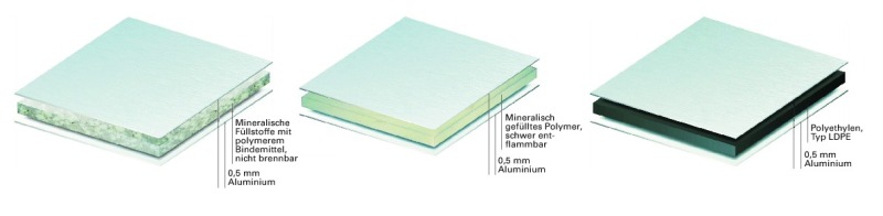 Bei einer Fassadenplatte aus Aluminium-Verbund handelt es sich um eine Sandwichkonstruktion: Ein Kern aus mineralisch gefülltem Compound wird beidseitig mit Aluminium kaschiert, wodurch eine große Biegesteifigkeit erzielt wird. Wie bei einem Doppel-T-Träger liegen die größten Materialdichten nun in der Zug-, bzw. in der Druckzone. Entlang der statisch neutralen Nulllinie befindet sich das leichte Material, das den Verbund herstellt. So entstehen leichte, sehr feste und plane Platten. Ein weiterer Vorteil dieses Schichtaufbaus ergibt sich hinsichtlich der Akustik. Entsprechend dem Masse-Feder-System entkoppelt die Kernschicht die beiden starren Metallplatten. Dies zeitigt einen starken Dämpfungseffekt: die Fassadenplatten selbst werden „entdröhnt“, was sich etwa bei auftreffendem Niederschlag angenehm bemerkbar macht. Außerdem üben die Fassadenelemente auf diese Weise eine schalldämmende Wirkung aus; der Rw-Wert ist mit 27 dB angegeben, das entspricht in etwa der Wirkung eines einfach verglasten Fensters. Dieser an sich gering erscheinende Wert ergibt im Rahmen der gesamten VHF eine Verdopplung der Schalldämmung des tragenden Mauerwerkes.