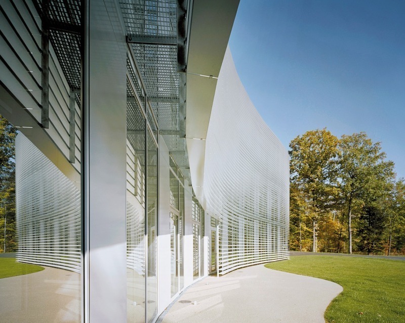 In unmittelbarer Nähe zu anderen Luftfahrteinrichtungen der Universität Stuttgart steht das Gebäude an einer Biegung. Die Kurve übersetzte das Universitätsbauamt Stuttgart und Hohenheim in eine geschwungene Gebäudeform. Kontrastreich hebt sie sich von den rechteckigen Gebäuden in ihrer Umgebung ab. Im dreigeschossigen, fast 60 m langen Neubau verteilen sich auf rund 1 800 m² Büros, Labore, Veranstaltungs- und Gemeinschaftsräume. Um dabei den Innenraum möglichst flexibel nutzen zu können, überspannen Deckenelemente die weiten Ausstellungsräume. Hinzukommen gebäudehohe Wandscheiben in der Fassadenebene, die durch Rückverankerung die Decken stabilisieren. Ein rhythmisierender Wechsel von Aluminium- und Glasflächen lässt gezielte Ausblicke zu. Gebogene Alumi-niumlamellen umfließen das gesamte Gebäude. Als zusätzlicher Sonnenschutz zum Wärmeschutzglas verringern sie den Wärmeeintrag in das Gebäude. Das homogene Erscheinungsbild des funktionalen Hybrids unterstreicht die Eigenständigkeit des Gebäudes.