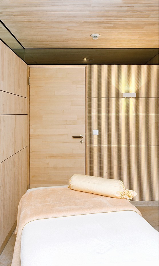 Gebäude verbindet zwei Materialien miteinander. Während der Kern und der Sockel des Neubaus aus Beton sind, wurden zwei weitere Etagen aus Holz gefertigt. Als Fassadenverkleidung wählten die Architekten Brettsperrholz aus Weißtanne. Die Materialwahl wird im Innenraum fortgeführt. Das Weißtannenholz schafft einen fließenden Übergang von den vorgesetzten Balkonen in die Gästezimmer. Dort ist es an der Decke als geschlitztes Akustikpaneel sowie als Bodenbelag zu finden. Die Gästezimmer orientieren sich mit ihrem offenen Grundriss zum Hang hin, während im hinteren Bereich des Raumes das Bad untergebracht ist. Die Architekten legten Wert auf natürliche Belichtung, auch im Bad, das mit einer Glasschiebetür zum Raum abgetrennt ist. Ebenfalls mit derselben Holzart modernisiert ist das Foyer. So erscheint der Um- und Neubau wie aus einem Guss.