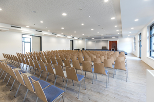 Sporthalle, Aula, Snoezelraum und Außenbereich sind für Grundschule und Kita zugänglich und nutzbar. Die Kita mit vier Gruppen und 100 Kindern wird über einen separaten Eingang ebenerdig an der Südwest-Seite erschlossen. Im Zentrum befindet sich eine Spielfläche mit Spielgeräten aus Holz und eine Bühne, die über eine Lichtkuppel mit Tageslicht versorgt wird und bei Bedarf auch als Aula genutzt werden kann. Von hier gehen die vier Gruppenräume ab, die jeweils mit einem Nebenraum und einer eigenen WC-Anlage ergänzt werden.