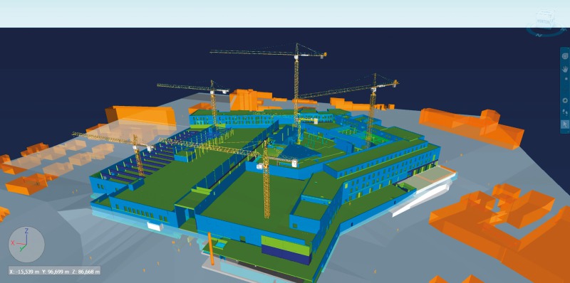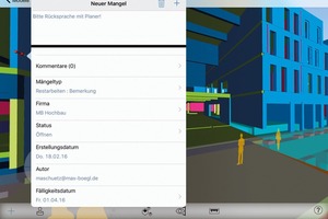 Für die Bauüberwachung arbeiteten die Bauleiter vor Ort mit Tablets, auf die die App Autodesk BIM 360 Field installiert war: Steuerbar über zahleiche Filter, konnte man sich in der virtuellen Baustelle an einen beliebigen Ort navigieren, um dort einen Marker zu setzen. Mit diesem wies man einem anderen Nutzer (etwa: einem Subunternehmen) eine konkrete Aufgabe zu (etwa: Fuge mit Kompriband füllen). Gearbeitet wurde auf der Baustelle oft offline – da beispielsweise in Kellergeschossen ein durchgehender Empfang nicht gewährleistet ist. Das Gerät lässt sich auf Knopfdruck synchronisieren, sobald eine WLAN oder LTE Verbindung besteht. Daraufhin wird eine automatische Mail generiert, mit der die Aufgabenstellung an den beauftragten Nutzer versendet wird.