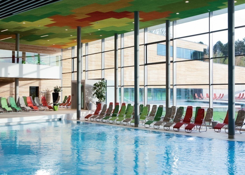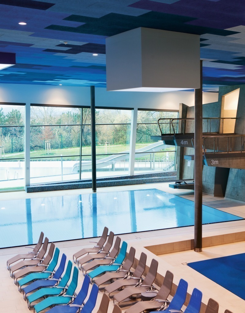 Orange, Grün, Rot, Gelb und Zinnober leuchtet die Decke der Thermalhalle 1 und verströmt so milde Herbstimmung. Große Galerien mit Ruheliegen säumen das freigeformte Becken. Es ist – wie alle anderen auch – weiß gekachelt. „Da ist die Wasserfarbe am schönsten“, so Ditschuneit. Die Halle ist nach Osten orientiert und öffnet sich mit einer zweigeschossigen Isolierglasfassade und Durschschwimmkanal nach draußen. Damit sich die Scheiben nicht beschlagen, werden sie mit konditionierter Luft mit 31°C bestrichen.