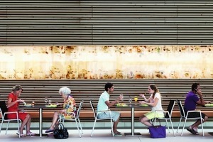 „Wir haben die Therme Wien um den Bestand herum gebaut: sie bildet einen Bogen um den Badegarten mit der Liegewiese und schließt direkt an den Kurpark an“, sagt Andreas Ditschuneit, Projektleiter der 4a Architekten. Neubau und Abriss verliefen phasenweise synchron, das alte Sportbecken aus Edelstahl wurde in den Bäderbogen integriert. Auch das runde Fitnesscenter blieb als prototypisches Relikt der Postmoderne erhalten. Es bildet gleichsam den Schlussstein, in dem die Vergangenheit auf die Zukunft trifft.