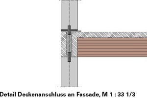 Diese Elemente wurden komplett vorgefertigt. Mit einer Wanddicke von 48 cm verzeichnen sie einen U-Wert von 0,12 W/m2K. Innen sind die Fassadenelemente mit OSB-Platten beplankt, außen mit einer zementgebundenen Holzfaserplatte, die als Trägerplatte dient. Die Fassadenelemente wurden mit Holz-Aluminium-Verbundfenstern geliefert. Diese sind 3-fach verglast und lassen sich öffnen. Der Fensteranteil ist mit über 50 % sehr hoch. Im Bauablauf folgen Deckenelement auf Fassade, Fassade auf Deckenelement und so weiter.