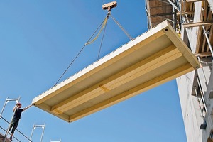 Bei den Deckenelementen haben die Planer das Optimum zwischen Masseträgheit (Schallschutz), Gewicht und Beton-Verbundkonstruktion gewählt. Herausgekommen sind rund 2,7 m breite und 8,10 m lange Holz-Beton-Verbunddecken mit Brettschichtholzträgern. Das Aufbringen der rund 8 cm dicken Betonschicht erfolgte in der Vorfertigung direkt im Betonwerk. Die Decken sind so konstruiert, dass zwischen den Holzbalken der Verbunddecke die Versorgungsleitungen der Haustechnik verlaufen. Die Verbindung zwischen Holz und Beton erfolgt durch Schubtaschen und Schrauben, welche vor dem Betonieren zur Hälfte in den BSH Träger geschraubt wurden. Der Verbindungsdorn an der Oberseite der Stützen und die Metallplatte mit zwei Stiften an der Unterseite bilden dabei sowohl die Verbindung zwischen Stützen und Decken als auch die eigentlichen Abstandshalter, um jeweils ein gesamtes Geschoss zu nivellieren. Sind die Deckenelemente eingehängt und ein neues Stockwerk fertig gestellt, wird die Dornverbindung mit Beton vergossen und damit kraftschlüssig verbunden. An den Stößen werden die Deckenelemente ebenfalls mit Beton vergossen. So entstehen schubfest miteinander verbundene Scheiben. Teilweise wurde in der Entwicklungszeit sogar mit 1:1-Modellen gearbeitet, um die Details genau betrachten zu können. „Das bewahrte uns auf der Baustelle vor unvorhergesehenen Überraschungen“, so Kaufmann.