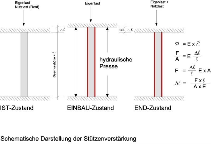Häufig sind vorhandene Tragfähigkeiten für zukünftige Nutzungen nicht mehr ausreichend. Ein probates Mittel stellt dann die Verstärkung durch eine Zusatzkonstruktion dar. Sie ist jedoch nur wirksam, wenn sie ein mit dem Bestand identisches Verformungsverhalten aufweist. Die Lastabtragung durch Zusatzkonstruktionen ist immer nur über zusätzliche Verformungen möglich. Deshalb sollten Verstärkungen in der Regel mit einer Vorspannung, die den Bestand entlastet und die Zusatzkonstruktion direkt aktiviert, eingebaut werden. Lastumlagerungen bzw. -erhöhungen führen dann zu einer Verformung der Zusatzkonstruktion und zu einer weiteren Entlastung des Bestandes bzw. einer Lastumlagerung.