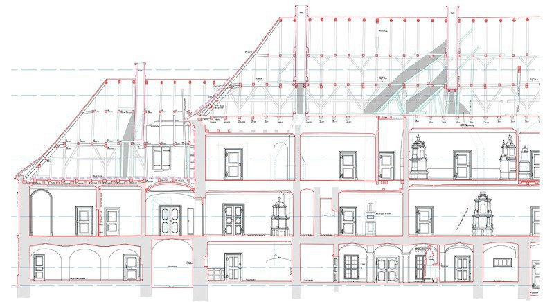 Die vollständig erhaltenen Dachkonstruktionen aus der Erbauungszeit sind ein besonderer Schatz der Klosteranlage. Durch die großen, zimmermannsmäßig aufwändig gearbeiteten Holzkonstruktionen (Abb. 7) verlaufen sogar nach wie vor die gemauerten Kaminzüge, die – abgestützt auf Holzgerüste – im Dach verzogen wurden, um von außen ein einheitliches, symmetrisches Erscheinungsbild zu gewährleisten.