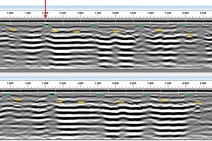 Im Papstzimmer, in dem eine Aufnahme der besonders wertvollen, bemalten und zweilagig kreuzweise verlegten Dielen ausgeschlossen war, stellte die Untersuchung der Bodenbalken die Planer und Gutachter vor besondere Herausforderungen. Aufgrund des doppelten Dielenbelags konnte die Lage der Balken nicht über die Nägel in den Dielen ermittelt werden. Die Lage der Balken konnte schließlich mittels Georadaruntersuchung erfasst werden (Abb. 6). Auf den Radargrammen konnte neben der exakten Lage der Deckenbalken zudem der in den anderen Räumen beobachtete zweischalige Deckenaufbau sowie die Lage von eisernen Schlaudern gut nachvollzogen werden.