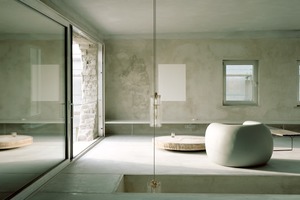 Ehrlicherweise muss man sagen, dass sich das Konzept in letzter Konsequenz so nicht durchführen ließ, da die vorhandenen Rechenmodelle des Wärmenachweises bereits an dem Vorhangstoff scheiterten. Um als Dämmmaterial in die Berechnung einfließen zu können, muss ein Material eine Stärke von 2 cm oder mehr aufweisen. Ein Vorhangstoff findet in der DIN keine Berücksichtigung. So wurde schließlich doch eine Fußbodenheizung eingebaut, die über eine Erdwärmepumpe versorgt wird. Die Antivilla erfüllt so auch rechnerisch die Anforderungen der EnEV. Funktioniert hätte die Idee aber auch ohne die Fußbodenheizung, weiß Brandlhuber aus seinen Erfahrungen im Haus.