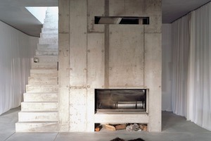 Während es sich bei den Bestandsaußenwänden nicht um Beton, sondern um Mauerwerk mit einem typischen geschlämmten DDR-Rauputz handelt, dominieren den minimalistisch gestalteten Innenraum neben Estrichboden, verputzten Innenwänden und der Verspachtelung der Dachunterseite der rohe Beton des Kerns und der dazugehörigen Treppe zum Dach. „Mich fasziniert an Beton, dass er so amorph ist, nicht richtungsgebunden. Und dass er alle möglichen Formen und Funktionen bis hin zur Arbeitsplatte einnehmen kann“, erläutert Brandlhuber. In der Antivilla handelt es sich aber nicht um hochwertige Sichtbetonoptik mit ausgeklügeltem Schalungsmuster, sondern um ordentlich ausgeführte Handwerkerleistung zu einem bezahlbaren Preis.