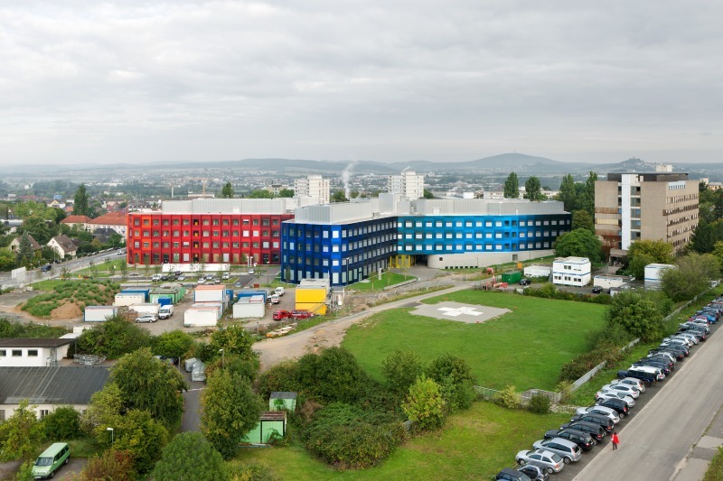 Ein ähnliches Prinzip der Farbauswahl wandten die Architekten Behles & Jochimsen bei der Gestaltung der 500 m langen Fassade des Biomedizinischen Forschungsinstituts in Gießen an. Der Grundriss zeigt eine amöbenartige Struktur mit fünf Fingern, in denen jeweils ein Forschungsbereich integriert ist. Fünf Leitfarben changieren in der Lochfassade in 32 Farbtönen von dunkeln zu hellen Paneelen. Der Farbverlauf von Hell zu Dunkel geht immer von der Fingerspitze zu den manchmal engen Finger-Zwischenräumen. Ein jedes der vorgefertigten Betonfassadenelemente gruppiert je vier gleichfarbige Alupaneele um ein rahmenloses, in der Regel ca. 2 x 2 m großes quadratisches Fenster. Niemals grenzen zwei gleichfarbige Fassadenfelder aneinander. Den so erzeugten horizontalen Bändern steht eine vertikale Schuppung entgegen, was neben der Farbigkeit und der geschwungenen Fassade das markante bauliche Erkennungszeichen des Bauwerks ist. Im Inneren gruppieren sich vier Finger um ein natürlich belichtetes Atrium in Sichtbeton und matt reflektierenden Aluminiumbrüstungen. Die primäre Fassadenfarbe des jeweiligen Fingers findet sich in der Wandfarbe der Flure, Treppenhäuser und Einbauten wieder. Hier fungiert Farbe als Erkennungszeichen des jeweiligen Forschungsbereichs. Alle Laborbereiche sind standardmäßig weiß möbliert, die Hörsäle schwarz. Die moderate Farbgebung der Innenräume betont durch schwarze PVC Bodenbeläge die sachlich ruhige Atmosphäre von Forschung und Lehre.