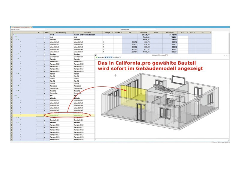Mit dem Modul BIM2AVA wird aus dem digitalen CAD-Gebäudemodell im BIM-Prozess das kaufmännische Gebäudemodell im AVA- und Baukostenmanagementsystem California.pro. Durch die bidirektionale Verbindung kann jedes AVA-seitig betrachtete Bauteil direkt im 3D-Modell lokalisiert werden und umgekehrt. Das automatisch erzeugte Raum- und Gebäudebuch (RGB) liefert eine präzise Mengen-ermittlung für Bauteile und Leistungen und wird bei Änderungen des Modells aktualisiert. Automatisch werden für gleichartig spezifizierte BIM-Objekte wie Wände, Decken, Fenster etc. Bauteil-Varianten angelegt. BIM2AVA ermöglicht eine schnelle, präzise Kostenermittlung, die auch Änderungen der Planung korrekt berücksichtigt.