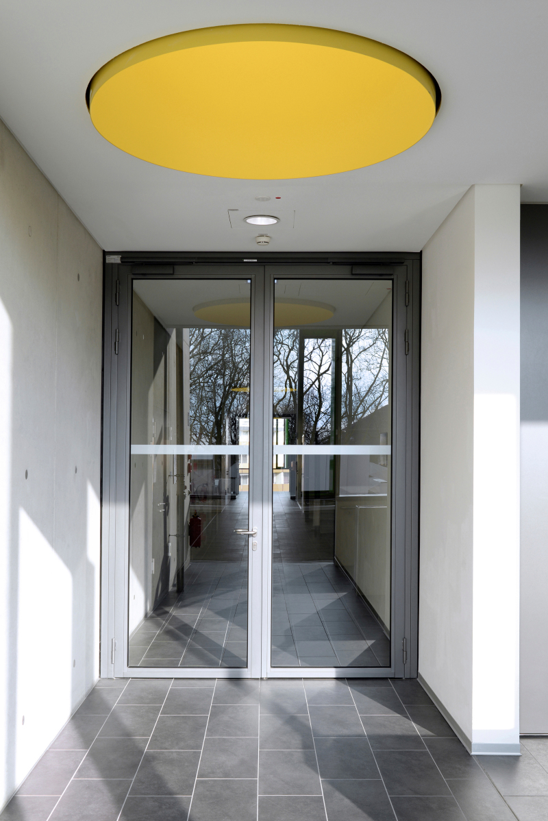 Streckmetalldecken im Inneren und geschickt platzierte gelbe oder zurückhaltend graue Oberlichter wirken als Blickfänger, so wie die in den Treppenhäusern bewusst sichtbar gelassenen technischen Installationen. Hier kommt auch Sichtbeton verstärkt zum Einsatz.