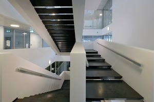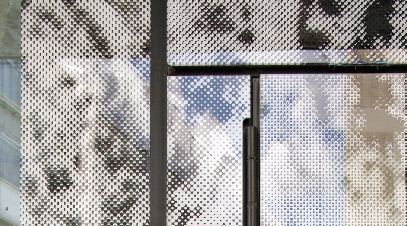 Ein außen liegender Sonnenschutz erschien den Architekten unpassend für den konzeptionellen Ansatz eines monolithischen, ikonenhaften Baukörpers, weshalb sie sich für eine Integration desselben in eine „Close-Cavity-Fassade“ (CCF) entschieden. Bei dem System gibt es eine innere und eine äußere Verglasung mit einem dazwischen liegenden 24 cm tiefen Hohlraum. Thermisch aktiv ist ausschließlich die innere hochwärmegedämmte Dreifachverglasung. Das äußere Glas besteht aus VSG und wurde mit dem markanten Aufdruck versehen. Der Zwischenraum birgt den mechanischen Sonnenschutz – in diesem Fall ein aluminiumbedampfter Vorhang. Die Architekten wollten den harten Konturen der Glasfassadenfläche etwas Weiches entgegensetzen. Die Textilie ist transluzent, also nicht völlig blickdicht. Dies ist bedeutsam, da die Verschattung zentral gesteuert wird und nicht individuell übersteuert werden kann. Das nach dem Minergie-Standard errichtete Gebäude besitzt nämlich keine leistungsfähige Klimaanlage sondern nur Kühldecken. Der eigentliche Vorhang wird als wartungsfrei betrachtet. Entsprechend kommt man an ihn von innen nicht heran. Als die kritischste Einheit gilt der Storenmotor. Dieser ist über eine Revisionsöffnung zugänglich, die in den Bürobereichen oberhalb der abgehängten Decke liegt. Um das Eindringen von Schmutz und Feuchtigkeit durch die Spalte in den glä-sernen Zwischenbereich zu verhindern, wird über eine permanente Luftzufuhr ein leichter Überdruck in diese Fassadenkästen gepumpt.