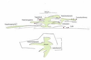 Kein „Ort der stillen Schönheit“, wie ein Wettbewerbsteilnehmer seinen Entwurf übertitelte, und damit weit über das hinaus und daneben schoss, was ein onkologisches Exzellenzzentrum sein kann. Denn hier geht es nicht um Davos’sche Dekadenz à la Zauberberg, die Bauherrenallianz zwischen dem Deutschen Krebsforschungszentrum (DKFZ) und dem Universitätsklinikum Heidelberg mit Förderung durch die Deutsche Krebshilfe versteht die Klinik als ein weiteres der in Deutschland schon etablierten Spitzenzentren (Comprehensive Cancer Center, CCC). Hier soll „Exzellenz in der translationalen Krebsforschung mit interdisziplinärer Patientenversorgung“ verbunden werden. Die Architektur soll alle ambulanten und tagesklinischen Chemotherapien des Klinikums, die bislang im Otto-Meyerhof-Zentrum des Universitätsklinikums vorgenommen werden, in einem Gebäude unter Leitung der Abteilung Medizinische Onkologie zentralisieren. Das NCT nimmt damit die Ambulanzen der Abteilungen Medizinische Onkologie, Gynäkologische Onkologie, Dermatologische Onkologie, Neuroonkologie und der Radioonkologie und Strahlentherapie sowie die zentrale Chemotherapie-Tagesklinik auf, ergänzt durch spezifische Beratungsangebote für Patienten u.a. zur Ernährung, Bewegungstherapie und Psychoonkologie. Und als wäre das alles nicht genug, sind hier zudem die Kern-Forschungsbereiche des NCT untergebracht.