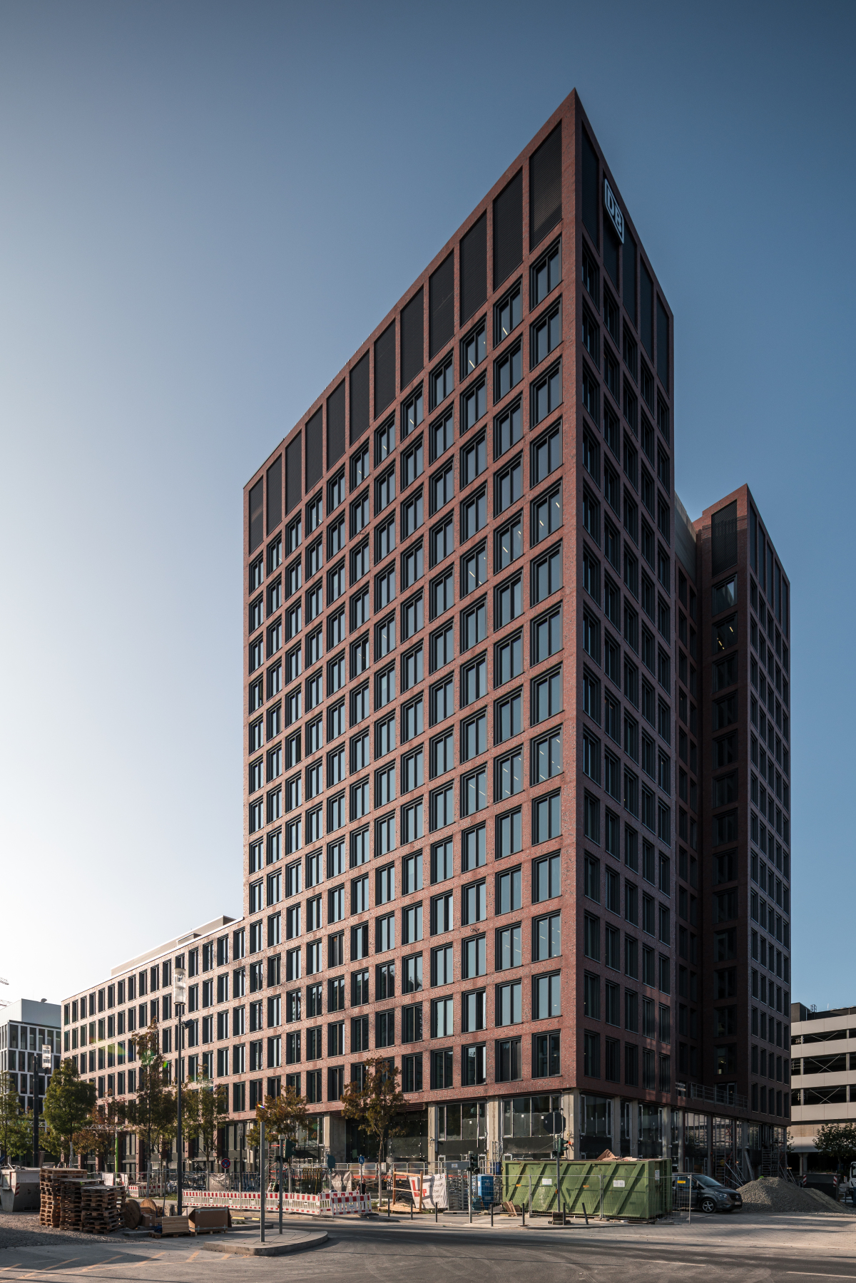 Nach dem Masterplan von AS+P entsteht seit Ende der 1990er-Jahre auf dem Areal des ehemaligen Güterbahnhofs südlich des Frankfurter Messegeländes ein neues Stück Stadt, das vormals getrennte Stadtteile miteinander vernetzen und weiteres innerstädtisches Wachstum ermöglichen soll. Zentrale Entwicklungsachse ist die Europa-Allee, entlang derer sich im nördlichen Teil vor allem Büro- und Gewerbebauten, im südlichen Wohnblöcke wie an einer Perlenkette aneinanderreihen. Auf einem der letzten zu schließenden Grundstücke planten Schmidtploecker Architekten seit 2012 für die Aurelis zunächst das multitenant Gebäude „Brick“ im Passivhausstandard mit Gewerbenutzung im Erdgeschoss, einem öffentlichen Innenhof und einer Durchwegung mit Gastronomieflächen laut Bebauungsplan. 2017 kristallisierte sich hierfür die Deutsche Bahn AG als finale Mieterin heraus mit dem Wunsch nach einer zusätzlichen Erweiterung um ein zweites Gebäude auf dem direkten Nachbargrundstück – den sogenannten „Tower“. 3 500 Mitarbeiter-Innen sollten nach Fertigstellung in das Ensemble einziehen.