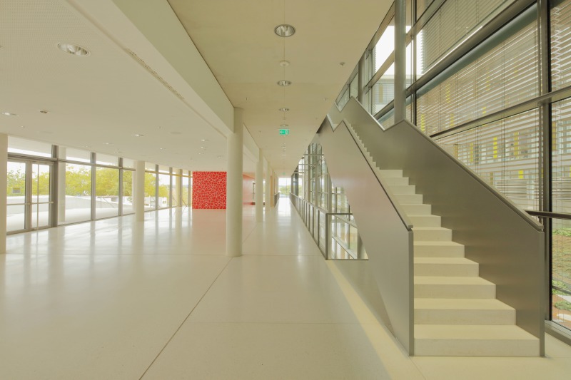 Das sich an Bauteil A anschließende C-förmige Bauteil B, nimmt die eigentlichen Institute und Forschungseinheiten auf. Beide Bauteile zusammen umschließen den erwähnten Innenhof. Überspannt wird dieser von zwei doppelgeschossigen Verbindungsbauten, von denen einer als Brücke ausgeführt ist, welche die ersten und zweiten Obergeschosse intern kurzschließt: die berühmten „kurzen Wege“ zwischen Forschung und Lehre. Die Forschungsräume gliedern sich in drei Bereiche: das Büro, die Laborfläche sowie der Doku-Zone. Das Büro liegt an der Außenfassade und wird durch einen Flur von den anderen Bereichen getrennt. An die Labore schließt direkt die Doku-Zone an, in der die Forschungsergebnisse dokumentiert werden. Nur durch eine Glaswand von den Experimentalbereichen getrennt, orientiert letztere sich zum begrünten Innenhof. Die Laborbereiche haben die Sicherheitsstufe 2; Schleusen hierein sind jedoch nicht erforderlich, allerdings ist eine erhöhte Luftwechselrate gefordert und das Tragen eines Kittels Pflicht. Die Grundrisse sind so konzipiert, dass die Nutzer direkt von ihren Büros in die Doku-Zone gelangen können und nicht wiederholt durch den Sicherheitsbereich müssen. Verti-kale Schächte in den Ecken des C-förmigen Gebäudes versorgen in zwei Richtungen die Labore in den unterschiedlichen Geschossen mit Frischluft.