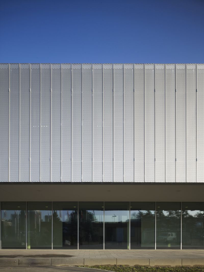 Ein großer Kontrast entsteht durch die zwei Hüllebenen: Um die drei Gebäudeteile zu einem Volumen zusammenzufassen, umhüllten die Planer den Riegel mit einer Glasfassade und mit Sonnenschutzläden aus Aluminium. Eine glatte Fassade innen, eine faltbare Struktur außen. Die Glasfassade reicht bis an die Oberkante der Attika und überdeckt beide Geschossdecken. Eine einheitliche, glatte Haut, in der sich die Umgebung leicht spiegelt und die – das sieht man in den Innenhöfen – ebenfalls kaum eine Kontur bildet. Selbst die Rahmenprofile der Glasfassade nehmen sich zurück, im Boden versenkt, hinter der Konstruktion der Aluminiumläden versteckt oder optisch in das Attikablech integriert. Die Glashaut ist dunkel und lässt die vorgehängten Metallläden hell leuchten. So wird die Aluminiumfassade zum Hingucker.