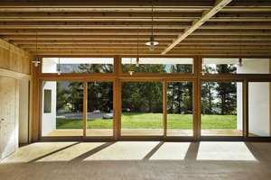 Räume für Kinder müssen nicht bunt sein. Die Architekten vertrauen bei der Materialisierung auf den Kontrast zwischen kühlen Betonoberflächen und dem duftenden Arvenholz. Die Arve ist mit ihren wilden Astformen neben der Lärche das typische einheimische Holz im Engadin. Der Einsatz für Wände und Decken in den Haupträumen eines Kindergartens war zunächst ungewohnt, aber die gemütliche Atmosphäre überzeugt heute. Wer schon einmal in einer traditionellen Engadiner Arvenstube saß, der kann erahnen, wie man sich hier fühlt. Im Kontrast dazu steht der Korridor aus Sichtbeton, der an die mit Kalk verputzten Innenwände eines klassischen Engadiner Wohnbaus erinnert. Der weißlich eingefärbte Sichtbeton ist außen und innen hydrophobiert, sonst aber nicht behandelt, auch nicht mit Graffitischutz. Das massive Arvenholz aus Wäldern des Unterengadins, das für die Wand- und Deckengestaltung sowie die Einbaumöbel verwendet wurde, darf hingegen gar nicht behandelt werden: