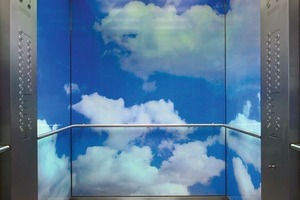 Auch auf dieser Seite des großen Teichs gibt es Beispiele für bemerkenswerte Aufzüge. Im Radisson Blu Hotel Frankfurt hatte der Architekt John Seifert (John Seifert Architects, London) die Idee, Wolkenmotive auf der Kabinenwandverglasung anzubringen. So wird die architektonische Vision einer transparenten Matrix, die in einer leuchtenden blauen Scheibe eingefasst ist, auch bei den Aufzügen fortgeführt: der Fahrgast ist selbst in der geschlossenen Kabine von weißen Wolken und blauem Himmel umgeben. Zusätzlich sind Monitore in den Kabinenfronten eingelassen und eine Zielrufsteuerung eingebaut. Die insgesamt acht Anlagen – unter ihnen eine Fünfergruppe mit zwei Aufzügen, die eine verglaste Kabinenwand bieten – haben eine maximale Förderhöhe von 75 m und fahren mit einer Geschwindigkeit von bis zu 3 m/sec.