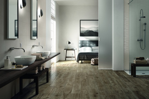 Natürlich hat Marazzi auf der Cersaie auch in 2014 eine Reihe von Neuheiten vorgestellt. Neben natürlich anmutenden Natursteinoberflächen präsentierte der Hersteller die Serie Treverkever, eine durchgefärbte Feinsteinzeugfliese, die wie eine Holzdiele erscheint. Das Format ist dementsprechend 20 x 120 cm, die Oberfläche ist gekennzeichnet durch Astlöcher und Farbabweichungen. Es gibt fünf Farbvarianten, Ash, Natural, Sand, Clove und Musk und passend dazu jeweils Sockelleisten im Format 7 x 60 cm. Treverkever eignet sich ideal – vorwiegend als Bodenbelag – im Wohnbereich und im leicht beanspruchten Gewerbebereich.
